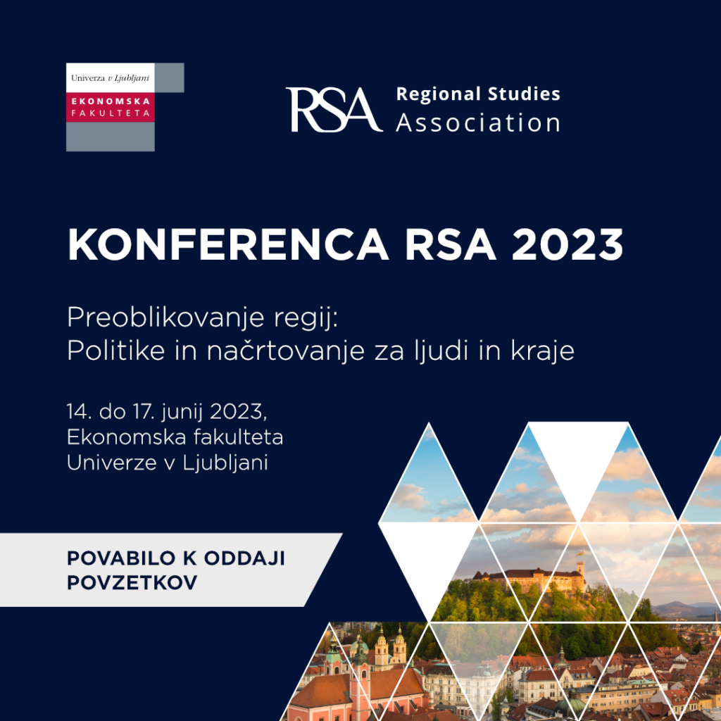 Na Ekonomski fakulteti Univerze v Ljubljani je od 14. do 17. junija 2023 potekala konferenca RSA (RSA ANNUAL CONFERENCE 2023), ki jo je Ekonomska fakulteta soorganizirala v partnerstvu skupaj z organizacijo Regional Studies Association in Ministrstvom za kohezijo in regionalni razvoj RS. Letošnja naslovna tema konference je bila Transforming Regions: Policies and Planning for People and Places.