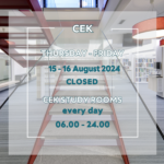 Dear CEK Library users! We would like to inform you that due to maintenance work, Pink and Green Study Area will be CLOSED on Saturday, 21 September 2024 and Sunday, 22 September 2024. Thank you for your understanding. During this time, you will still be able to access numerous e-resources via Digi*CEK. On eTutor*CEK you […]